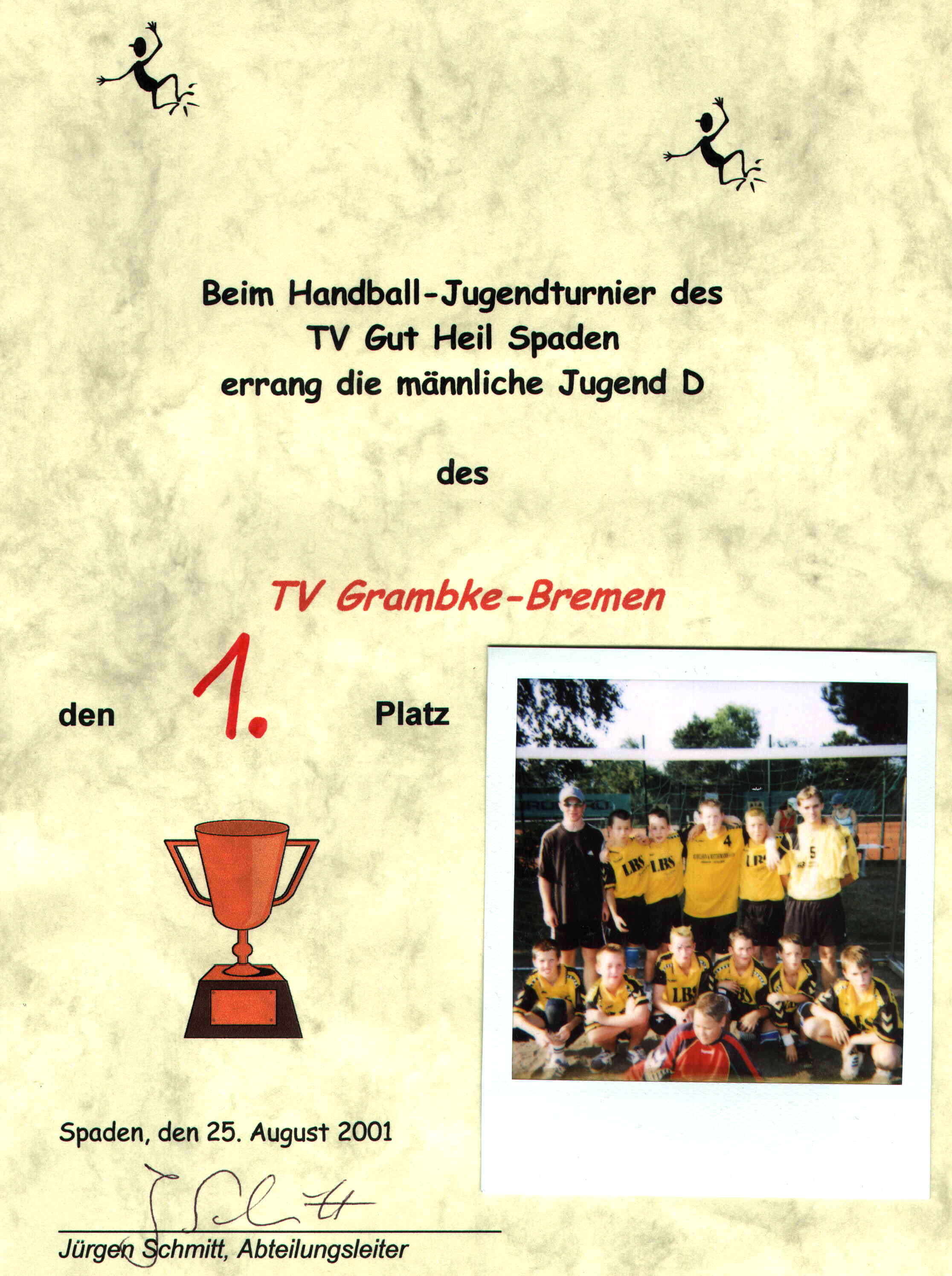 den Pokal und die folgende Siegerurkunde in Empfang nehmen.