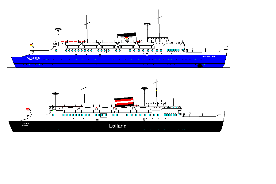 Lolland, die nun Wirklichkeit geworden war. Gemeinsam mit der Kong Frederik IX und der Theodor Heuss, welche die Deutschland 1957 als Flaggschiff der Bundesbahn abgelöst hatte,