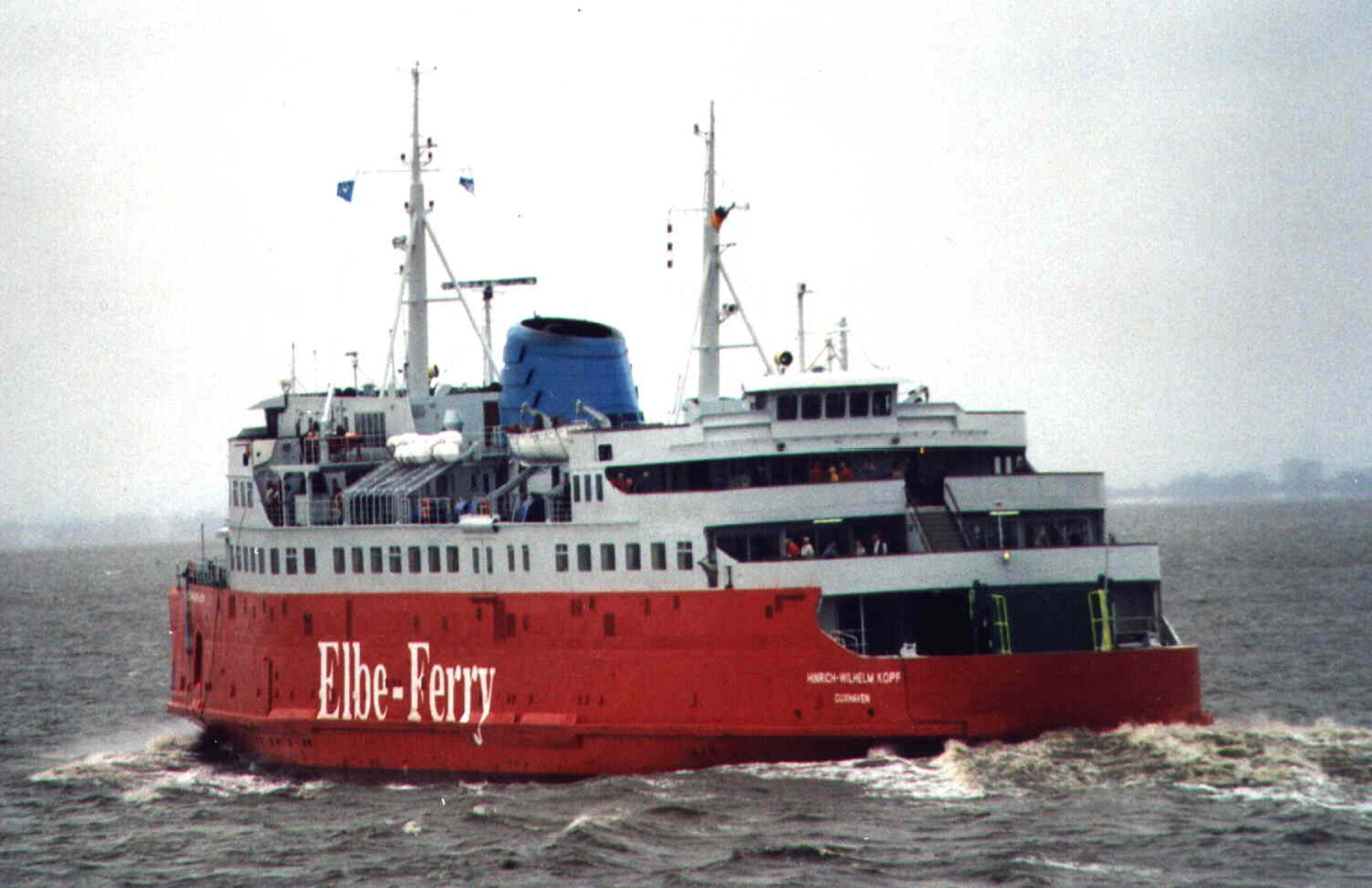 Ein grauer August-Vormittag. Erst seit kurzer Zeit verkehren die rot-grau (!) gestrichenen Fähren zwischen Brunsbüttel und Cuxhaven. Erstmals erreichte