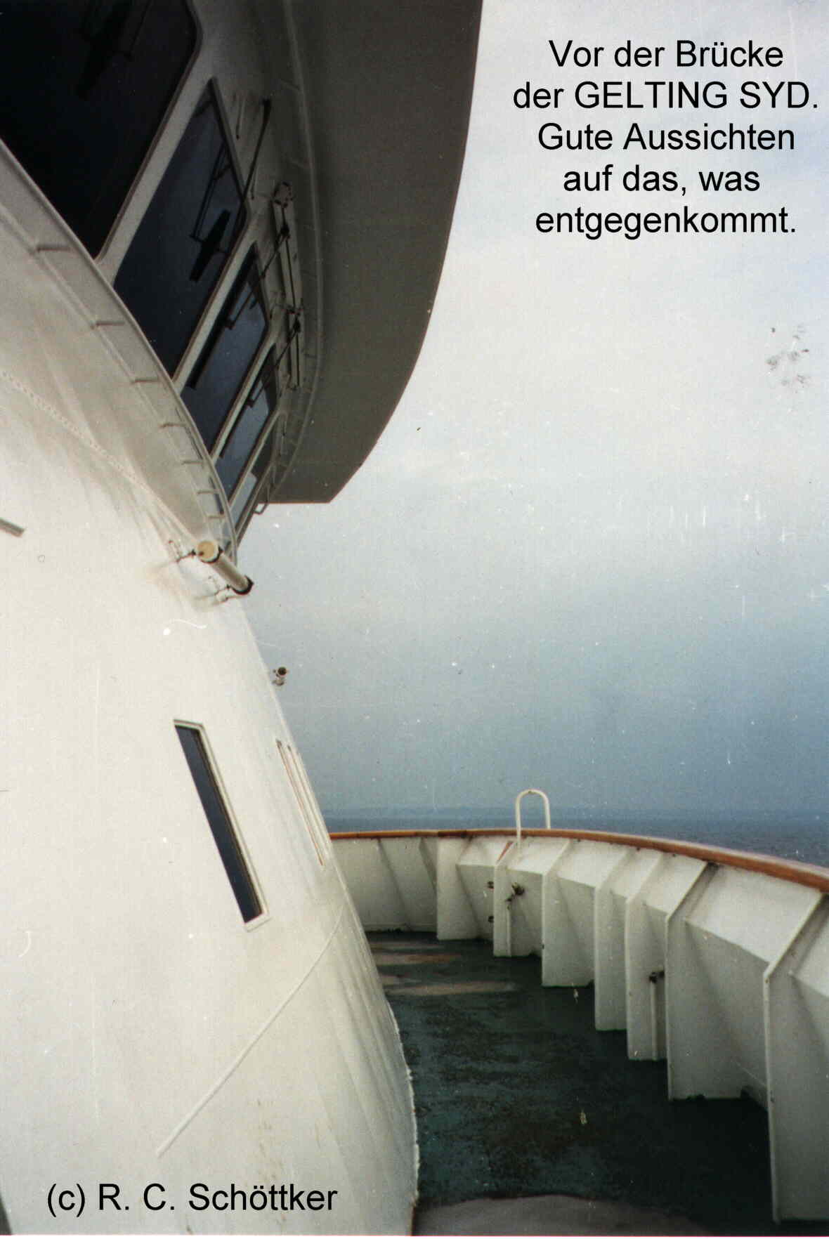 einem diesigen Oktobernachmittag 1994 von Faaborg nach Gelting übersetzte, waren einige Tonnen und ein Paar Möwen das einzige, was sich aus dem Wasser hervorhob. Einsam, ohne Gegenschiff, tut die GELTING SYD hier