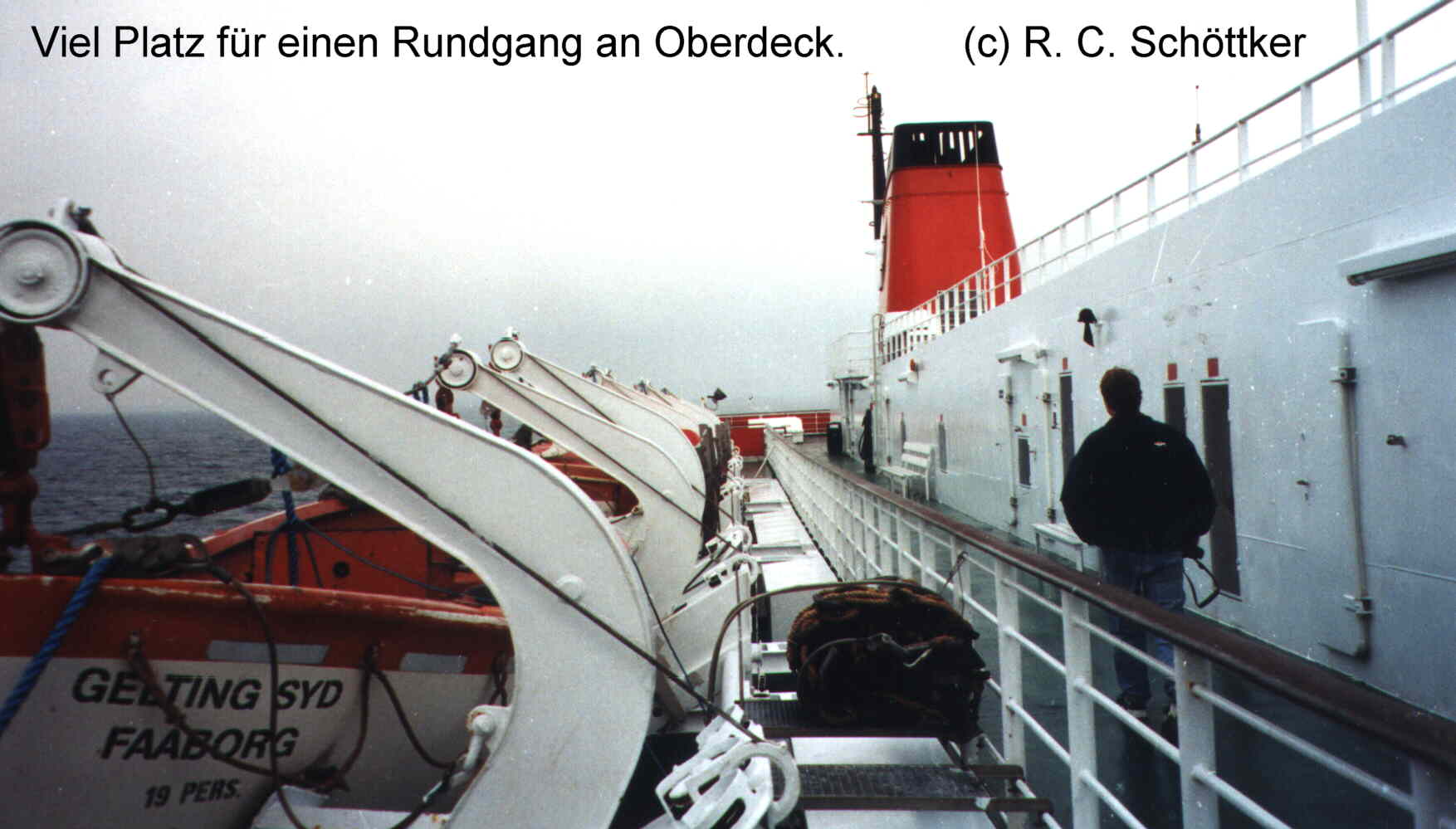 Fährschiff. Bleibt nur zu hoffen, daß die Reederei auch nach dem Wegfall der Zollfreiheit bestehen bleiben kann, denn von den geringen Fahrpreisen (2 Personen mit Auto für 13 DM, im Juli 26 DM) wird die Reederei